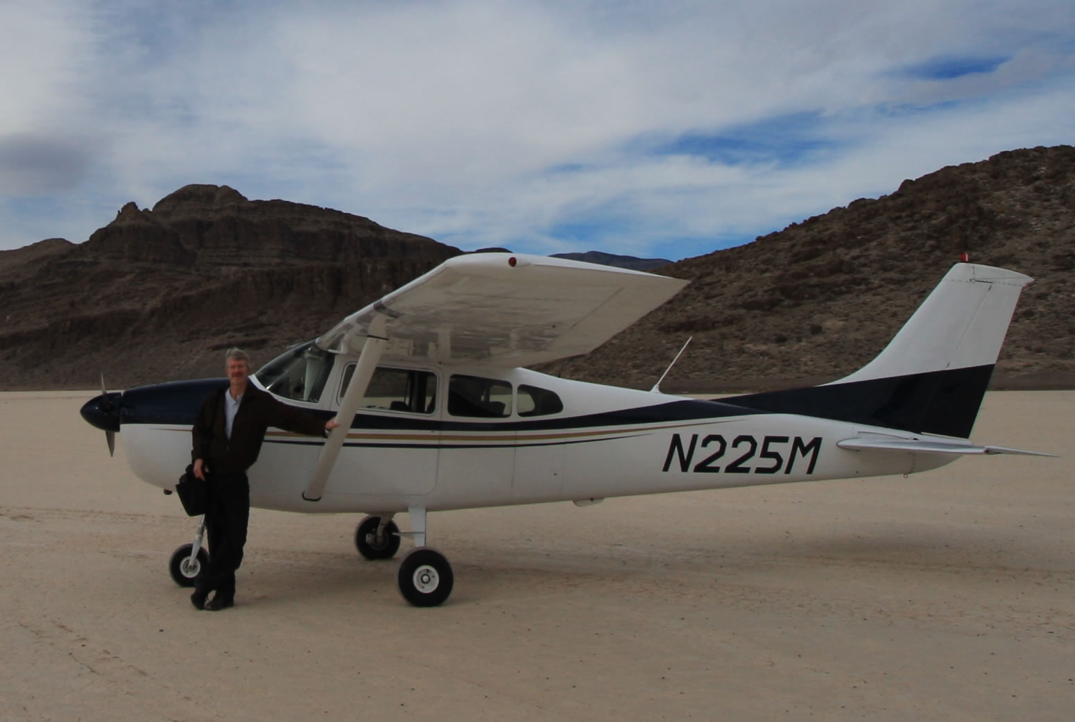 Mike on a dry lakebed with his co-owned 1960 Cessna 182 (before the 1st annual)